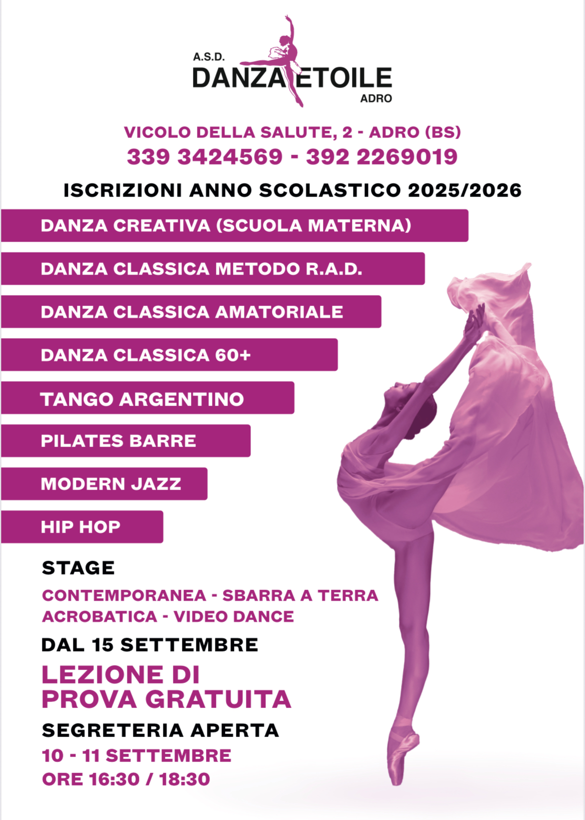 - HIP HOP: è una disciplina, adatta dai 7 anni in avanti, considerata danza sportiva che proviene dal movimento americano dell' hip hop e che unisce diversi stili come il popping, il locking, l'uprock e il b-boying. UNA LEZIONE SETTIMANALE DA 60 MIN